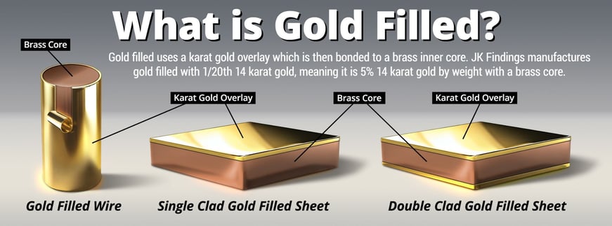 Gold filled metal is created by mechanically bonding a thick layer of solid karat gold to a base metal core, typically brass. In 1/20 14K gold filled material, the gold layer makes up at least 5% of the total metal weight (that’s where the 1/20 ratio comes from).